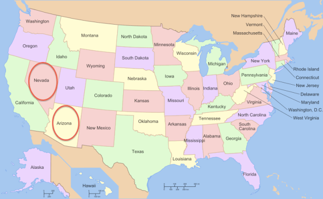| Map of USA showing Nevada and Arizona (Source: Wikipedia) |