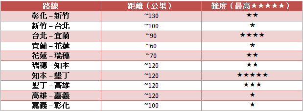 規劃路線比較簡單的方法,是打開Google Maps,敲定出發城市,然後決定環島方向。LonKonger今次從中部彰化出發,以順時針方向騎行,不過有朋友說逆時針路線靠海,所以風景比較美。如果你自問熱愛運動,可以每天騎大概100公里的話,不妨依照下表的路程環島;平時較少運動的可縮短每天的騎程,租車通過難度較高的山段(如北宜公路和南迴公路壽卡段),或者在喜歡的地方多留一兩天(城市人大多會選擇台北或高雄,愛自然風光的讀者就一定要多花時間在花蓮和墾丁了)。住宿方面,個人建議使用以下幾個網站搜尋各地的酒店或旅館:Trivago、Booking.com、HotelClub、Agoda、Otel、Expedia HK、携程和AsiaRooms。